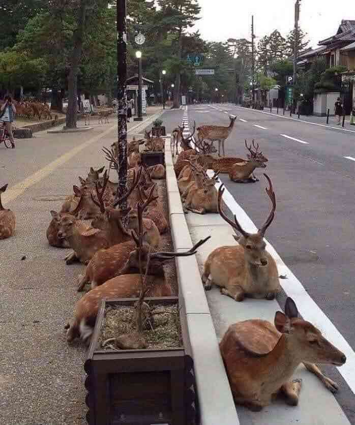 The deer leave the forest and come to the centre of the deserted road looking for sustenance