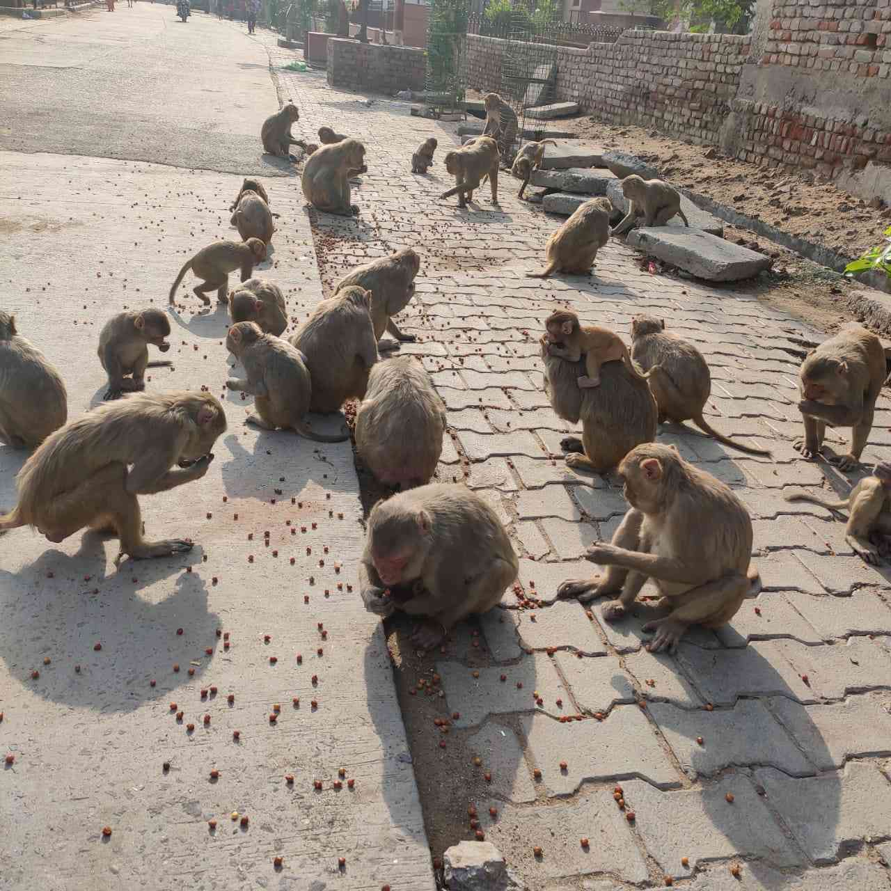 VKST distributes food packages to the awaiting folk and the hungry monkeys