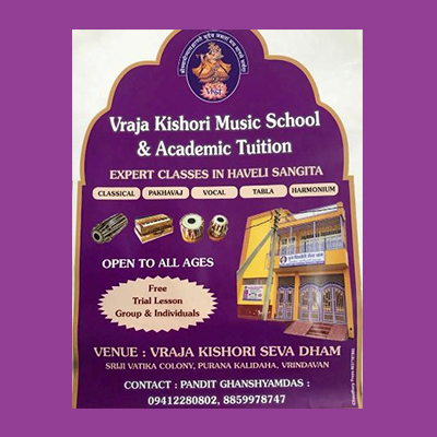 ****VrajaKishori Music school is the best place in Vrindavan to learn Devotional music, especially singing, harmonium, tabla and pakawaj. Here you can learn from a family of performers who are empowered by the centuries old lineage of Braj artists including the renowned poet Sri SurdasJi and the Ashtachap poets of the 16th century. (Presently, this rare and most precious devotional poetry is being translated into English so that language does not present a barrier to students).